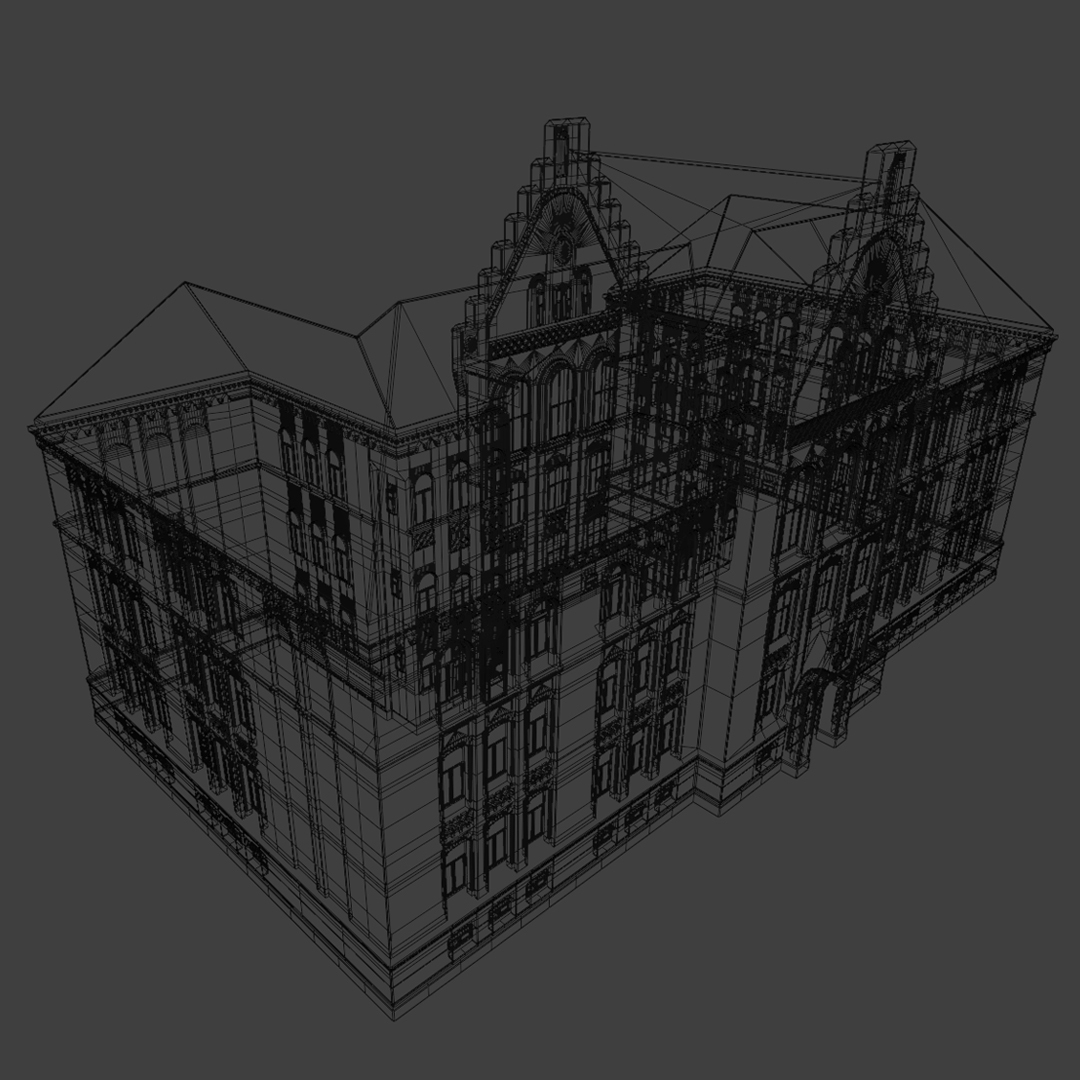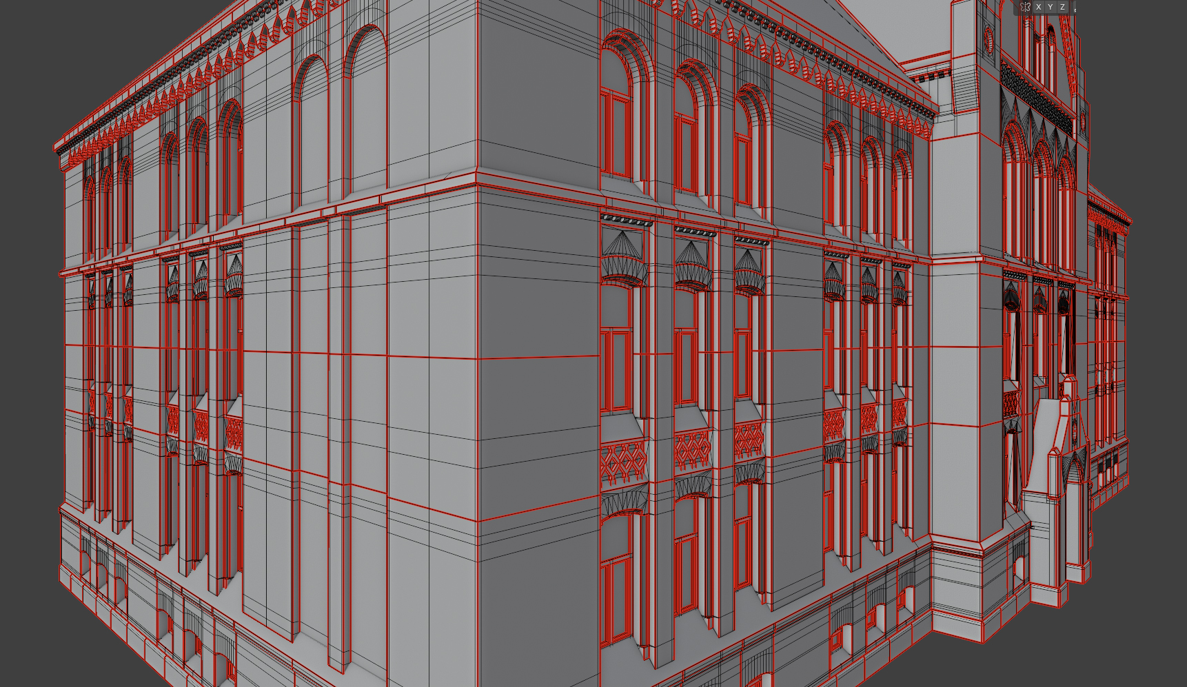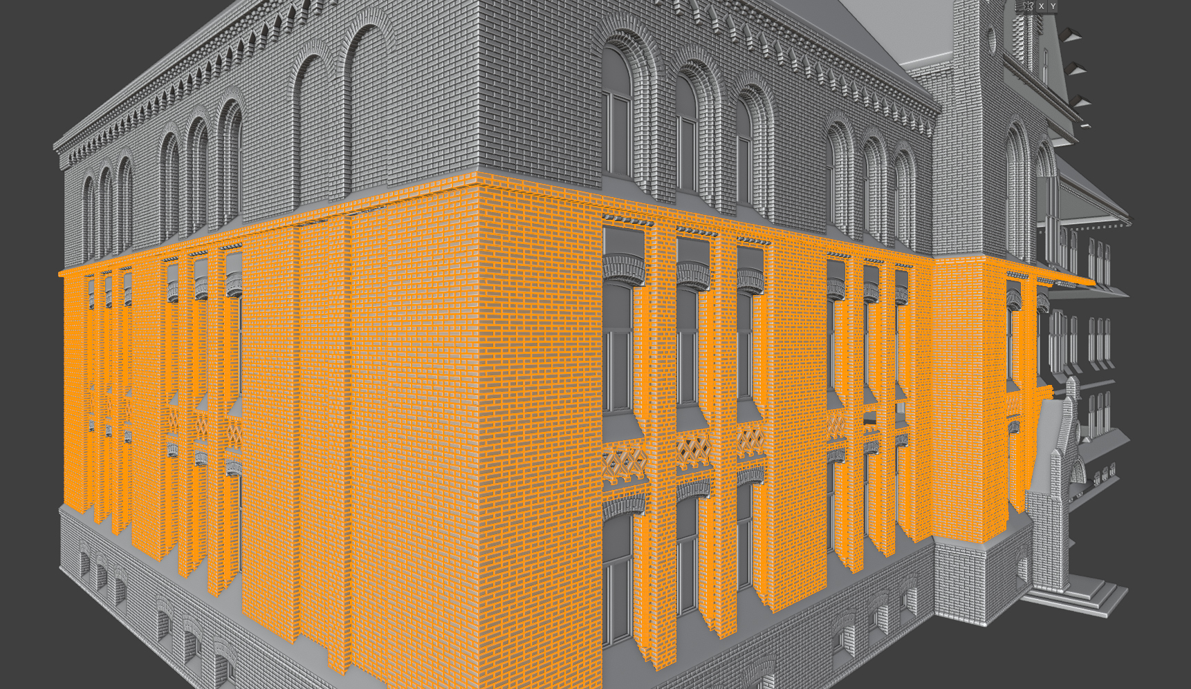 Чертежей здания в открытом доступе найти не удалось, поэтому за отправную точку был взят размер имперского кирпича, из которого предположительно было построено здание. Опираясь на фото с разных ракурсов была посчитана кирпичная кладка и построена high-poly модель для точного воспроизведения геометрии архитектурных деталей и использования её для запекания на low-poly модель.