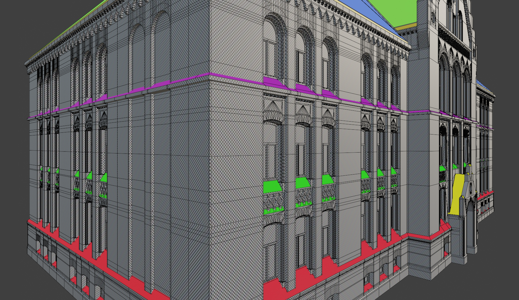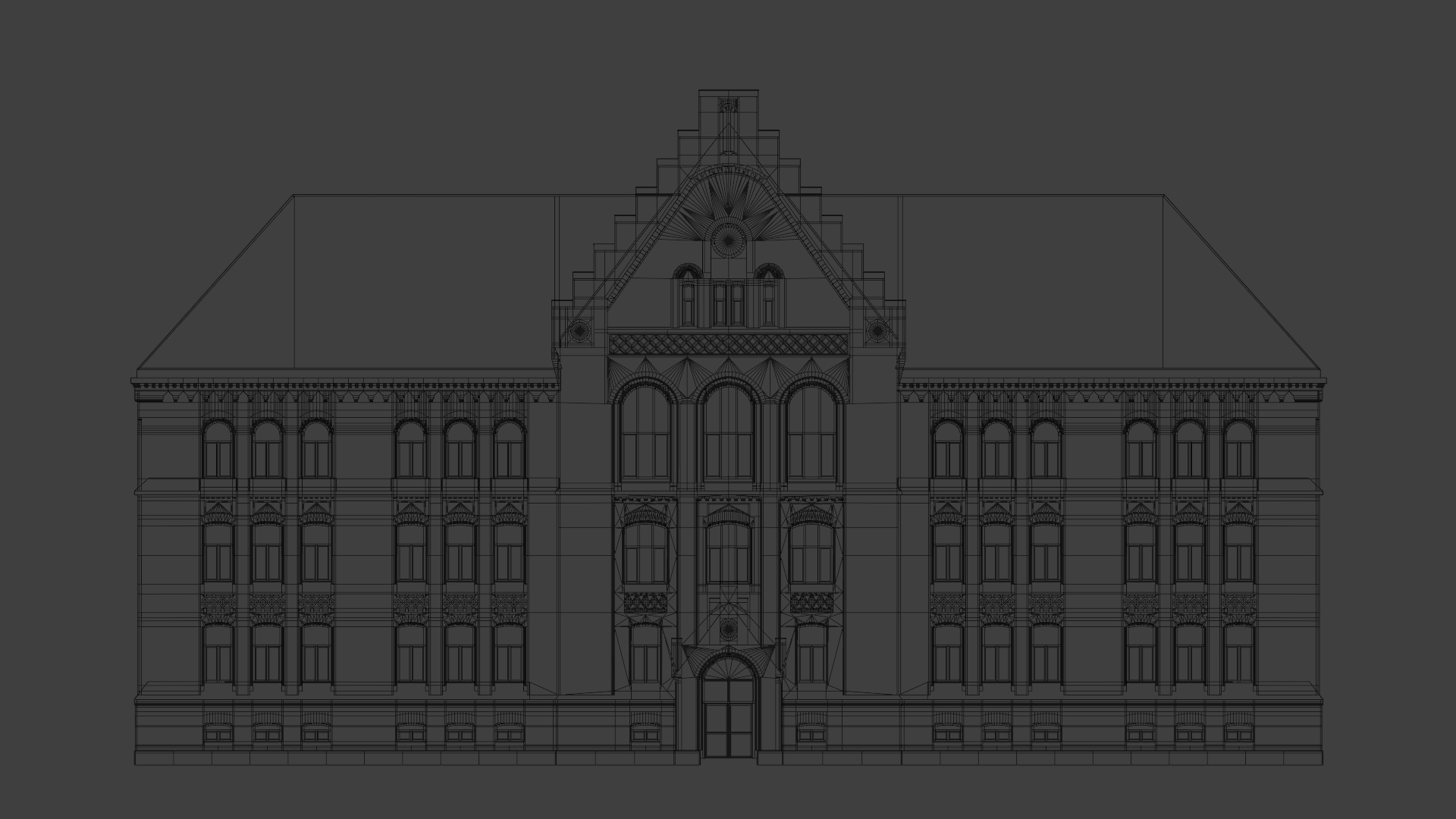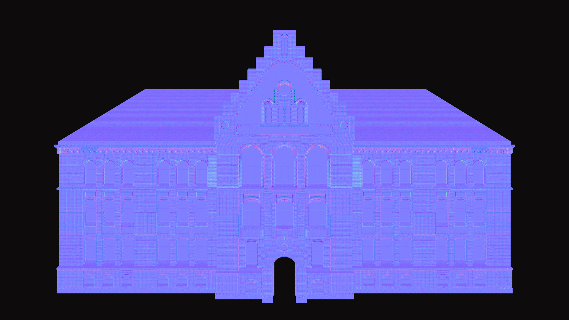 Чертежей здания в открытом доступе найти не удалось, поэтому за отправную точку был взят размер имперского кирпича, из которого предположительно было построено здание. Опираясь на фото с разных ракурсов была посчитана кирпичная кладка и построена high-poly модель для точного воспроизведения геометрии архитектурных деталей и использования её для запекания на low-poly модель.